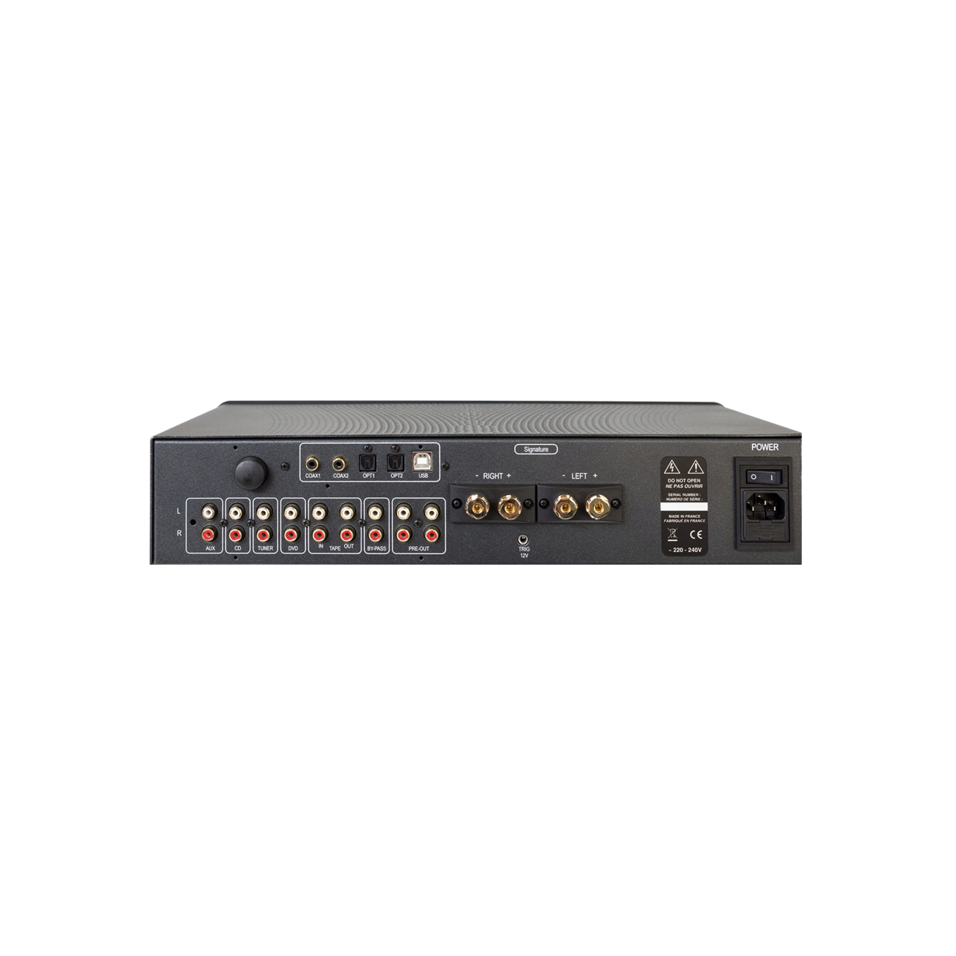 There is a standard set of inputs: four linear RCAs, an input for monitoring recorded material, and RCA jacks labelled as By-Pass, which provide direct access to the amplifier's final section. The outputs are represented by jacks for recording and two Pre Out jacks. There are only two pairs of screw terminals for connecting speakers.
