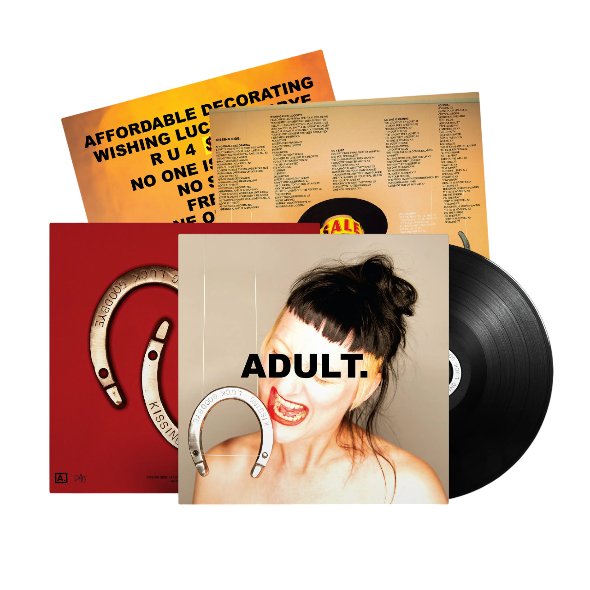 Rather than retreat, they focused on the process, revisiting their setup, complete with their first new mics in 20 years. They obsessed over textures, amassing a massive sample library taken from old thrift-store albums, previously used and unused ADULT. ingredients and new field recordings, running myriad items, including the buzz of shop vacs, through various pedals. Pause 'Kissing Luck Goodbye' at any moment, and you're likely to count a dozen things happening at once in strange, dizzying, and dissonant harmony. Together with producer Nolan Gray, whose involvement resulted from a chance encounter (he happened to be the host of the short-term rental property where the two stayed—maybe there is still some luck, after all), the band pushed themselves harder than ever before to build a world with this record.